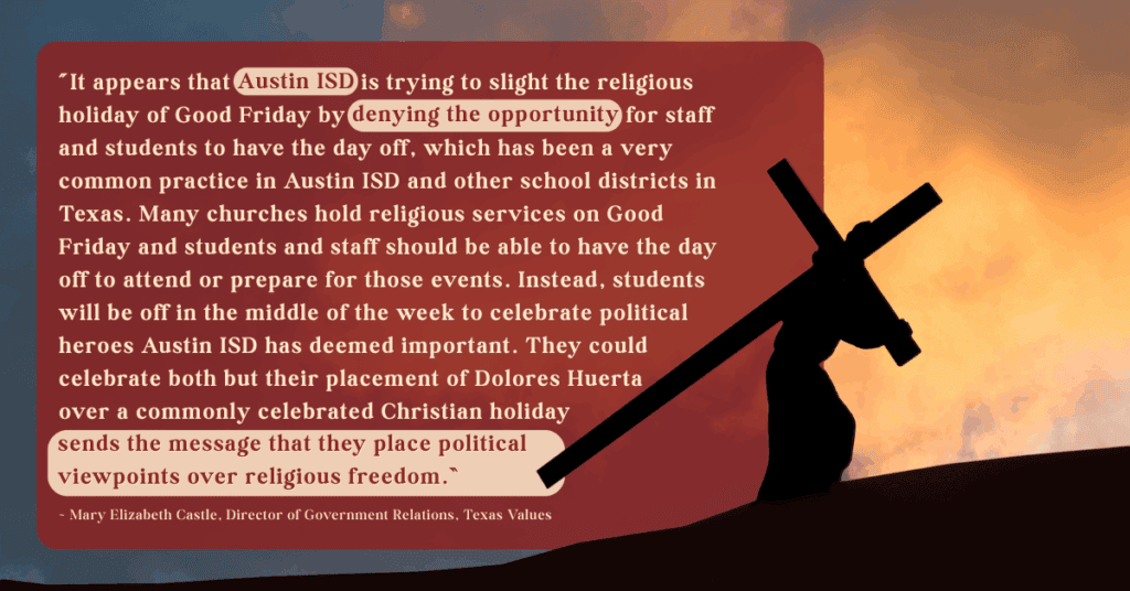 “It appears that Austin ISD is trying to slight the religious holiday of Good Friday by denying the opportunity for staff and students to have the day off, which has been a very common practice in Austin ISD and other school districts in Texas. Many churches hold religious services on Good Friday and students and staff should be able to have the day off to attend or prepare for those events. Instead, students will be off in the middle of the week to celebrate political heroes Austin ISD has deemed important. They could celebrate both but their placement of Dolores Huerta over a commonly celebrated Christian holiday sends the message that they place political viewpoints over religious freedom.”