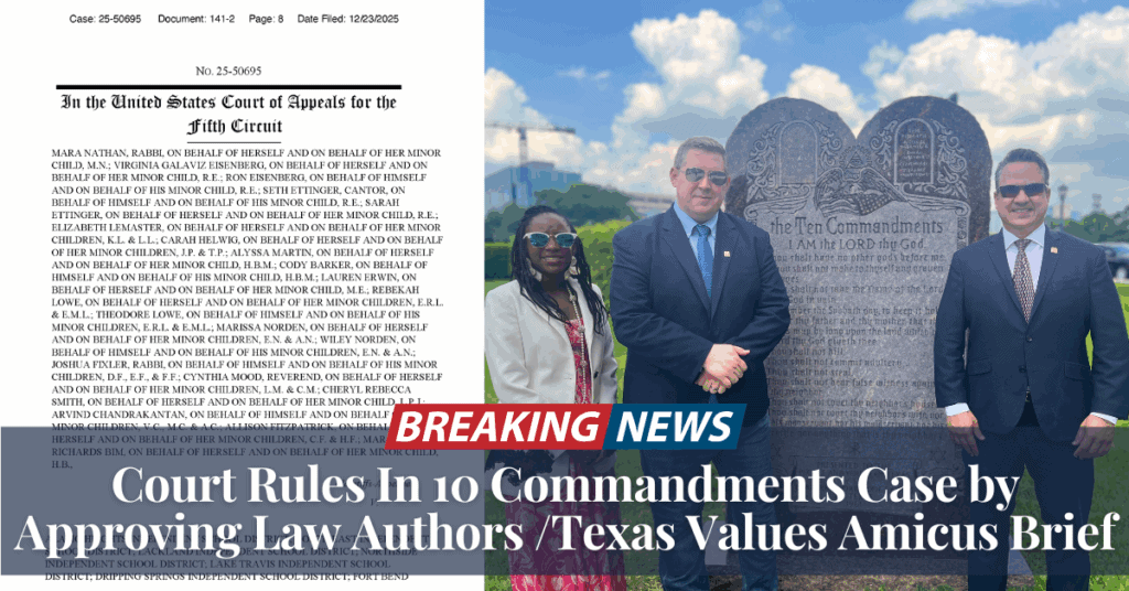 Austin, TX – December 31, 2025: Today, the federal appeals court approved the filing of Texas Values friend of the court “amicus brief” on behalf of Texas State Senator Phil King and Texas State Representative Candy Noble (the legislators who filed and championed the passage of the Texas Ten Commandments law in 2025) supporting the Texas Ten Commandments law at the 5th Circuit Court of Appeals. The legal amicus brief was filed on December 23rd, last week, but the ACLU had opposed the filing of the brief (which is highly unusual in such cases) requiring the court to issue an order on this matter specifically. The legal amicus brief filed by Texas Values can be found here.