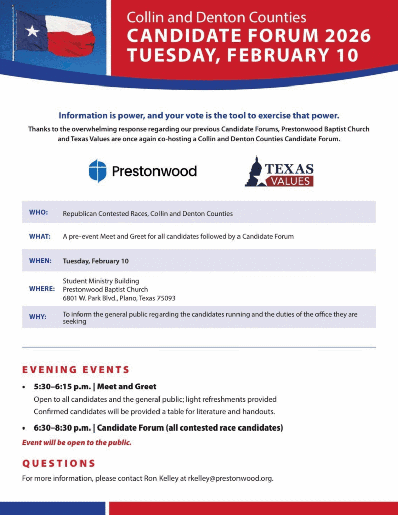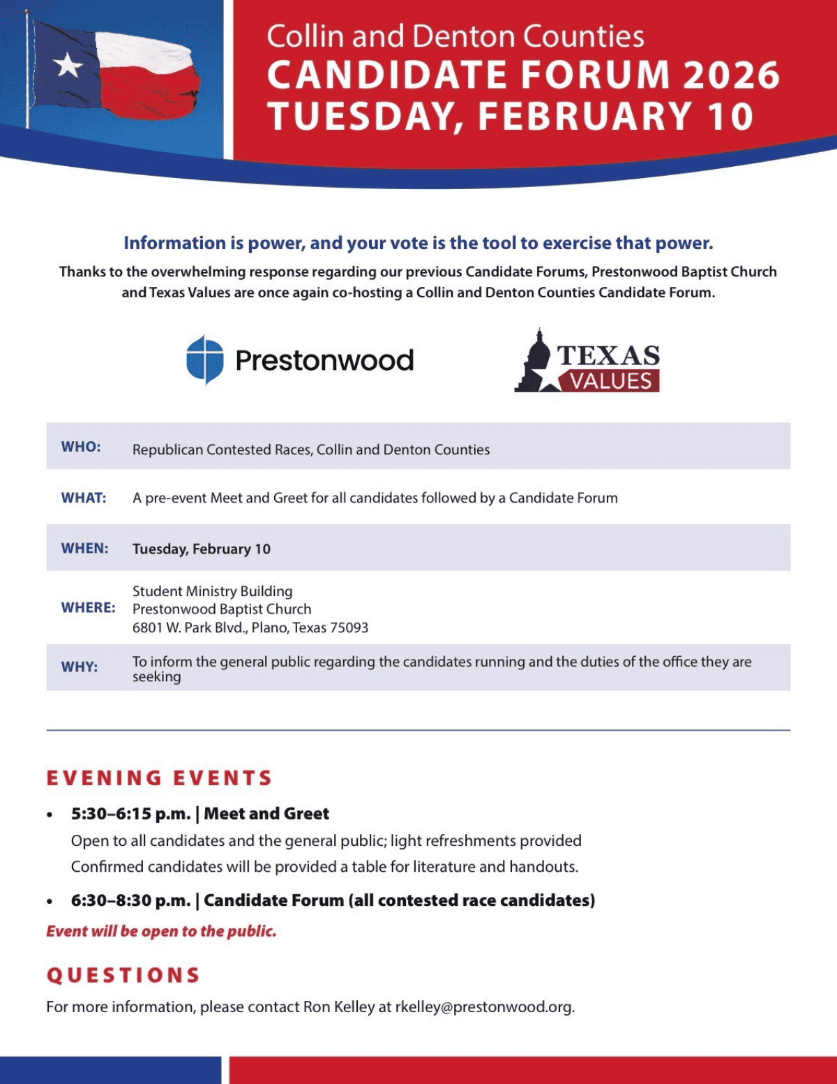 Event will be open to the public, and will also be livestreamed at prestonwood.org and on our website: https://txvalues.org/collin-denton-counties-candidate-forum/