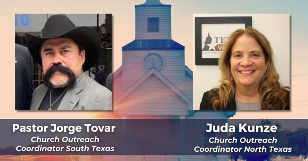 Please note our leadership has recently changed and we are happy to announce our co-interim leaders: Juda Kunze (North Texas Coordinator) and Pastor Jorge Tovar (South Texas Coordinator). Pastor Tovar and Juda have been with Texas Values for many years and both have faithfully been a part of our church outreach work since its inception.