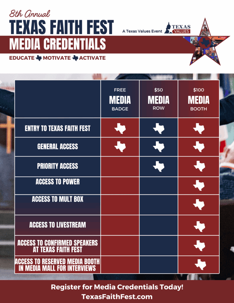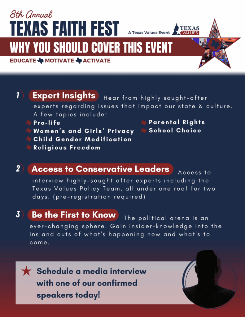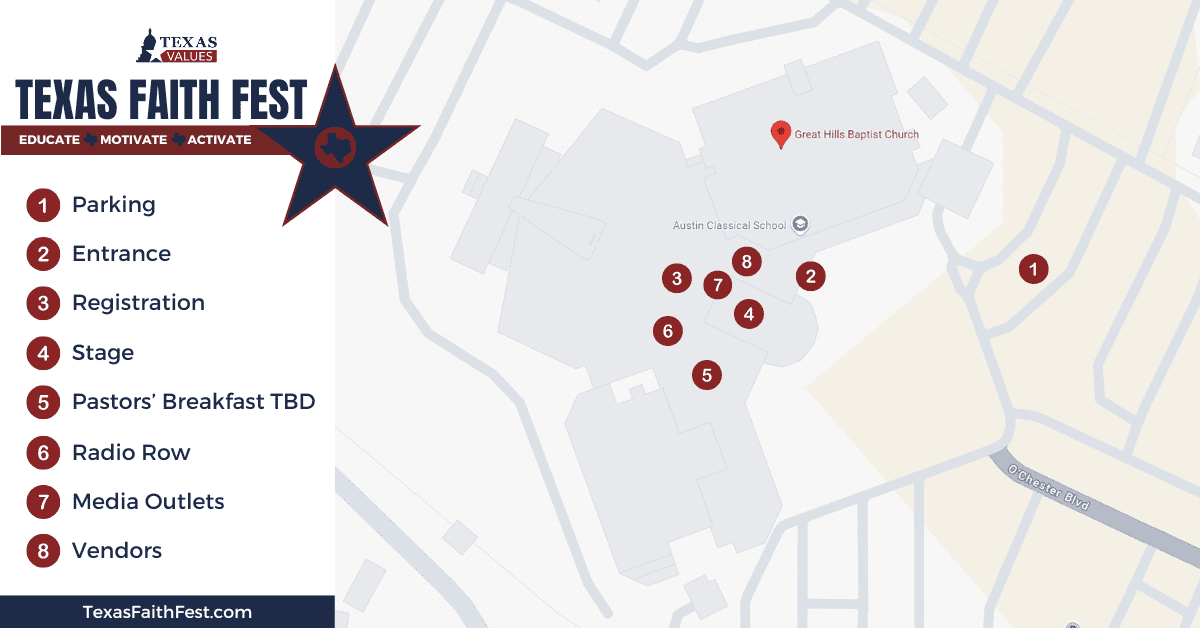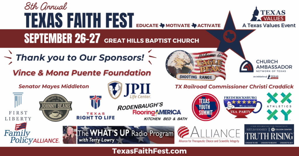 Texas Faith Fest is the largest event of its kind in Texas, running 8 years in a row. You will hear from leaders from across the state and nation as they discuss family values in public policy – including life, marriage, religious freedom, and human sexuality. You will also be educated by the leading experts in family policy in the legislature, courts, and media while being inspired by Texans just like you who are advancing pro-family values in the culture. Join us on September 26-27th at Great Hills Baptist Church, in the heart of the hill country, for two days of panels filled with faith & policy leaders where you will be educated, motivated, and activated to make a difference in YOUR community!