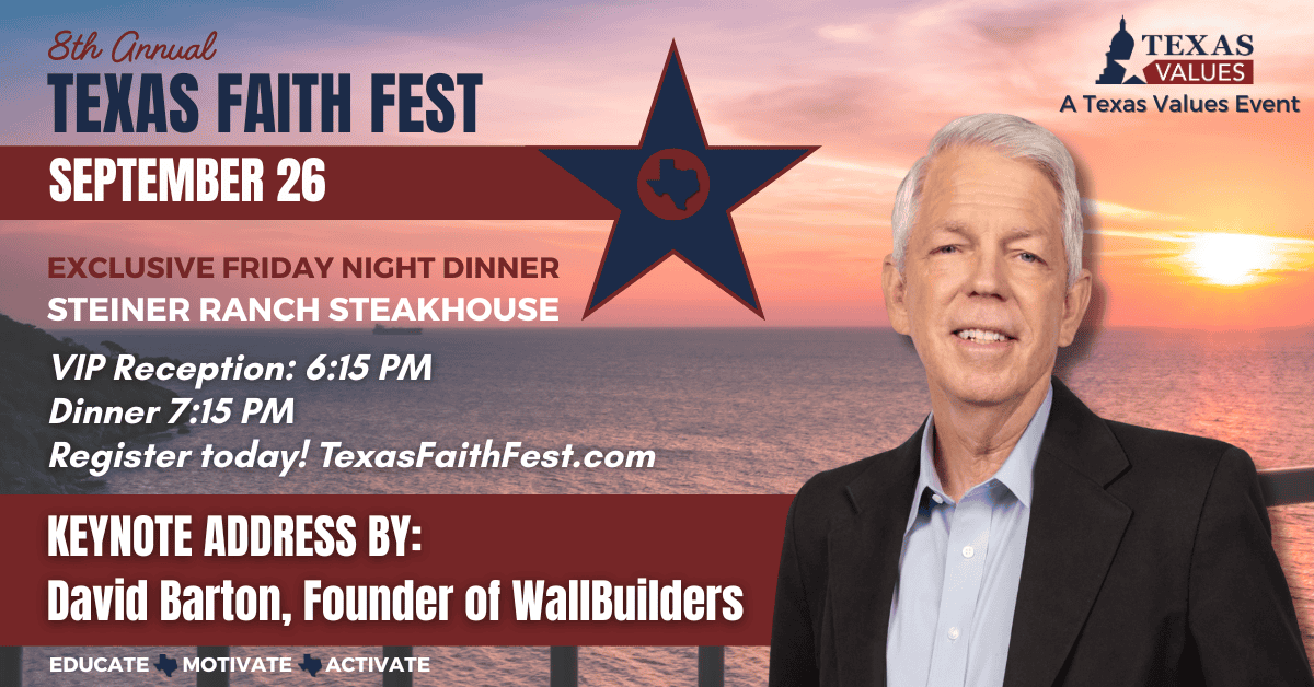 Texas Values is thrilled to announce that David Barton, founder of WallBuilders and renowned historian, will be the keynote speaker at our exclusive Faith Fest VIP Dinner at the iconic Steiner Ranch Steakhouse as an extension of our larger two-day event, Texas Faith Fest. Tickets purchased separately.